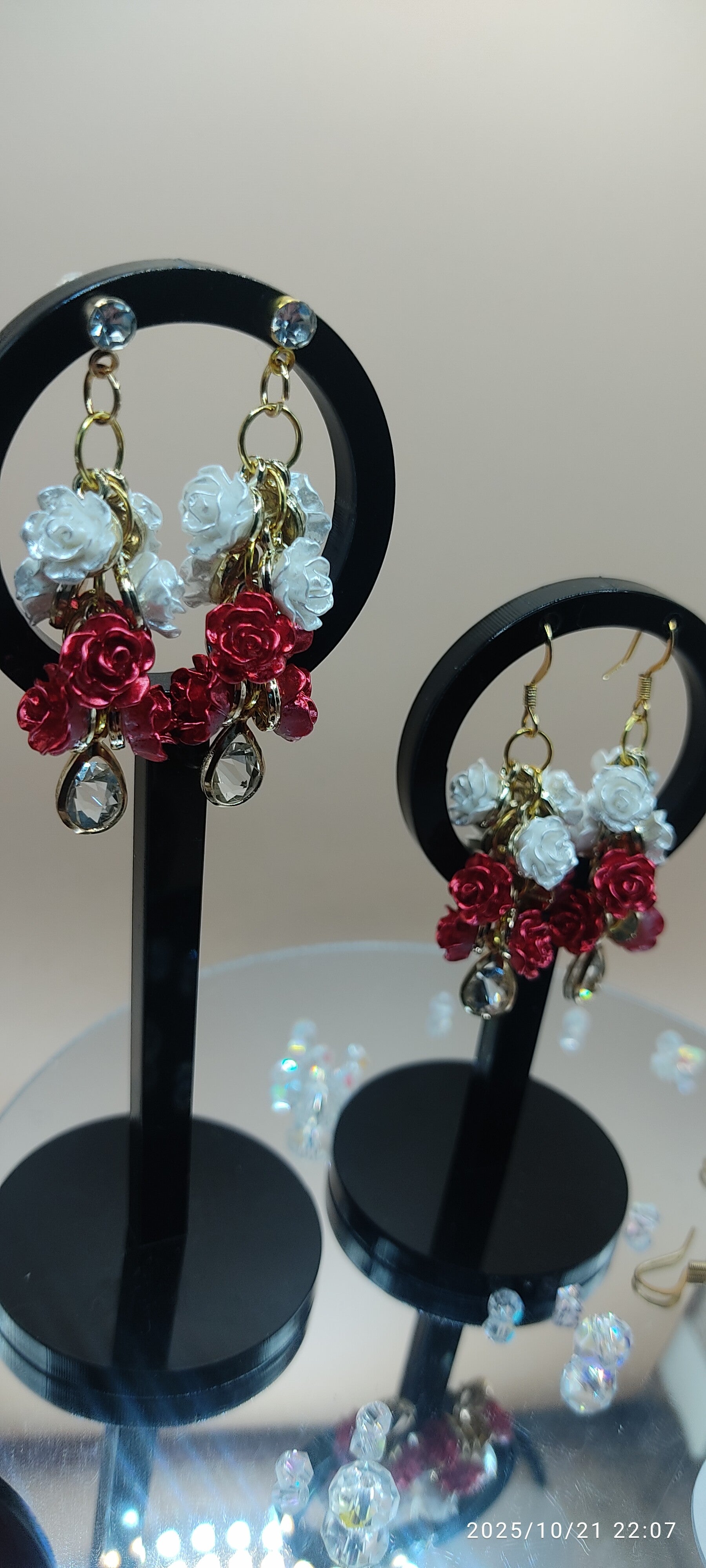 projekt kolczyków ,wykonany z dbałością o każdy detal. Mini różyczki biało czerwone zawieszone na haczyku stalowym lub wkretce w złotym kolorze.